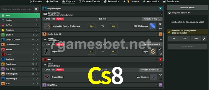 O Cs8 oferece uma grande seleção de opções de apostas em e-sports com probabilidades competitivas